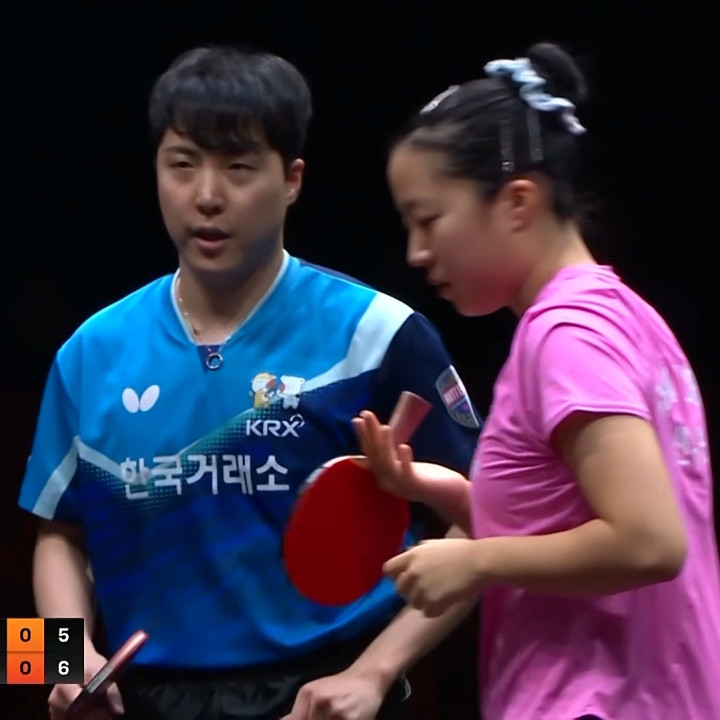 9-11莎头先输第一局,王楚钦一直在多担当多下重手,毕竟是孙颖莎有伤,很明显,孙颖莎发球跺左脚已是习惯,仔细看没有了,韩国队双打半决赛战胜了栋曼组合士气正盛,打的也不错…~
